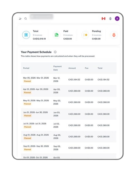If a payment fails due to insufficient funds or a declined card, the transaction will not go through. You will be notified in your Royalinvest.ca dashboard, so you can follow up promptly. This feature reduces the need for manual tracking and helps you manage late or failed payments efficiently.